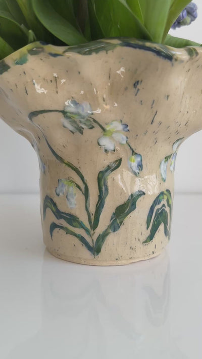 This unique vessel shape has the most perfectly imperfect ruffles and curves with the inside showcasing the abstract painterly layers of underglaze like a great Jackson Pollock masterpiece. The vessel showcases a parade of hand carved Snow Drop blossoms.